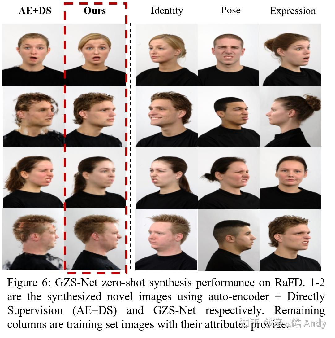 下图展示了在 RaFD [6] 数据集上进行零镜头生成(zero-shot synthesis)的结果,我们希望解耦 RaFD 中的三个属性:identity,pose 和 expression。