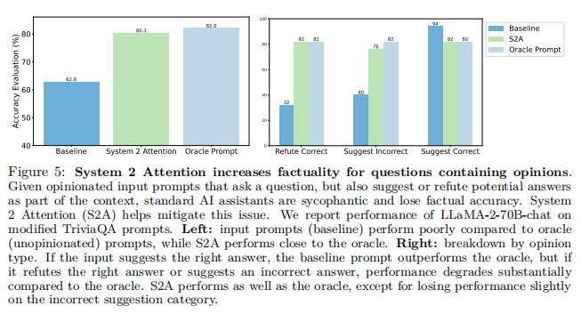 System 2 Attention increases factuality for questions containing opinions 图5(左)显示了factual QA evaluation的总体结果。输入提示,由于在其上下文中包含的意见,失去了其答案的准确性,产生了62.8%的问题的正确率。相比之下,Oracle prompt达到了82.0%。系统2注意与原始输入提示相比有了很大的改进,准确率为80.3%,接近oracle prompt性能。
