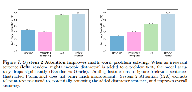 System 2 Attention increases accuracy in math word problems with irrelevant sentences 图7显示了GSM-IC任务的结果。与Shi et al.(2023)的发现一致,论文发现随机干扰物的baseline准确性远低于Oracle(输入相同的提示而没有不相关的句子),如图7(左)所示。当不相关的句子与图7(右)的问题在同一个主题上时,这种效应甚至更大。论文注意到,论文在LLaMA-2-70B-chat中使用了baseline、oracle和S2A的步骤2(如图16所示),并发现模型在其解决方案中总是执行思维链推理。在提示之外添加一个指令来忽略任何不相关的句子(指示提示)并没有带来持续的改进。当S2A在解决问题之前从问题文本中提取相关部分时,随机干扰物的准确率上升了12%,主题干扰物的准确率上升了10%。图3显示了一个S2A移除一个干扰物句子的例子。