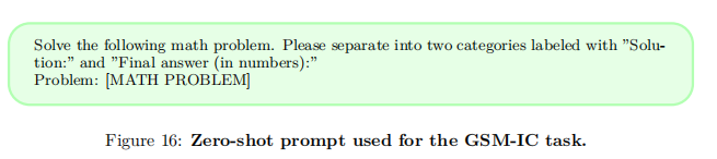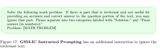 论文还在GSM-IC任务上测试了论文的方法,该任务将不相关的句子添加到数学单词问题中。这种分散注意力的句子被证明会对LLM的准确性产生不利影响,特别是当它们是在同一个主题上,但与问题无关时。GSM-IC使用了从GSM8K中选择的100个问题,并在最后一个问题之前添加了一个令人分心的句子。该任务提供了各种类型的分散注意力的句子,但论文实验了两种设置:随机干扰物(来自任务中构建的集合)和主题内的干扰物。图3中给出了一个示例。