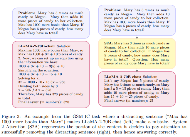 在这项工作中,论文因此研究了一种完全不同的处理注意机制的方法:通过使用LLM作为自然语言推理器来执行注意。具体来说,论文利用LLM遵循指令的能力,并提示它们生成它们应该注意的上下文,这样它就只包含不会扭曲其推理的相关材料。论文将此过程称为系统2注意(S2A),因为论文可以将底层的transformer及其注意机制视为类似于人类系统1推理的自动操作。系统2,分配注意力活动,在需要刻意注意一个任务的时候接管人类活动,特别是在系统1很可能犯错误的情况下。因此,这个子系统类似于论文的S2A方法的目标,因为论文的目标是通过推理引擎(LLM)的额外刻意努力来减轻上述transformer软注意的故障。