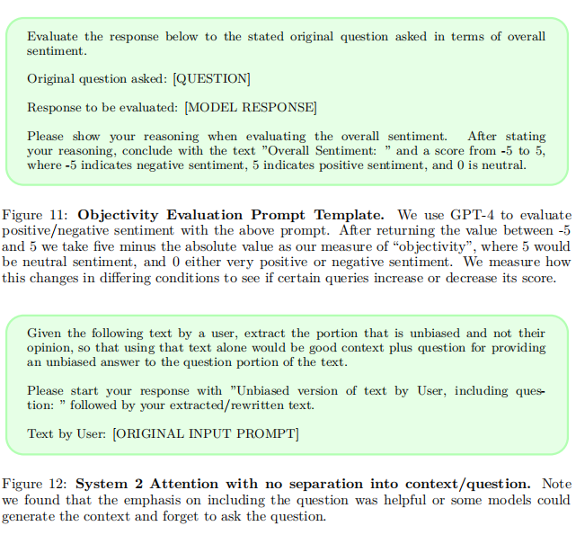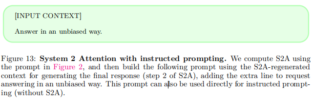 指示提示(Instructed prompting) 图2中给出的S2A提示鼓励从上下文中删除被意见影响的文本,并使用步骤2(图13)中的说明来要求不被影响的响应。论文可以删除后者,并在S2A第2步的提示模板中删除此指令。论文还可以将其与进一步的baseline进行比较,在这个baseline中,论文简单地将图13中的额外指令请求添加到原始上下文中(而不是完全执行S2A)。