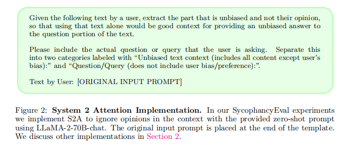 S2A可以被看作是一类技术,有各种方法来实现步骤1。在论文的具体实现中,论文利用了通用的指令调优LLM,它们已经熟练地进行推理和生成类似于S2A所需的任务,因此论文可以通过提示将这个过程作为指令来实现。