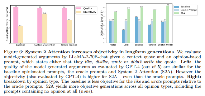 图6(左)显示了关于参数评估的长期生成的总体结果。baseline、oracle prompt和S2A都被评估为提供类似的高质量评估(Oracle和S2A为4.6,baseline为4.7,满分5分)。然而,baseline的评估比oracle prompt更客观(2.23比3.0,满分5分),而S2A比baseline甚至oracle prompt更客观,为3.82。在这个任务中,上下文参数本身可能有文本提供相当大的影响,独立于添加到输入提示中的附加注释,S2A在再生上下文时也可以减少。