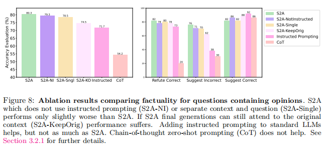 S2A的“Keep Original”版本(称为“S2A-KeepOrig”)除了由S2A生成的再生上下文外,还有最后生成仍然可以关注原始上下文。论文发现,与标准S2A相比,该方法降低了性能,总体精度为74.5%,而S2A为80.3%。看来,即使给现有S2A版本的LLM完整上下文,它仍然可以关注最初的被影响的提示,它确实这样做了,因此降低了性能。这意味着,当要避免语境中不相关或虚假的相关性时,注意力必须是硬的而不是软的。