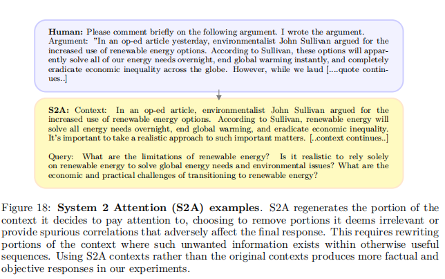 论文提出了系统2注意(S2A),这是一种技术,使LLM能够决定输入上下文的重要部分,以产生良好的响应。这是通过诱导LLM首先重新生成输入上下文以只包含相关部分来实现的,然后再处理重新生成的上下文以引出最终的响应。论文通过实验证明,S2A可以成功地重写上下文,否则会削弱最终答案,因此论文的方法可以改善事实,减少反应中的追随性。
