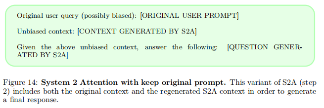 保留原始上下文 (Keep original context) 在S2A中,在上下文重新生成之后,包含了所有必要的元素,然后模型只给出重新生成的上下文x,因此原始上下文x被丢弃。如果S2A表现不佳,并且一些被认为无关并被删除的原始上下文实际上是重要的,那么信息就丢失了。在“保持原文”变体中,在运行S2A提示后,会将x添加到原始提示符x上,以便原始上下文和重新解释都可以供模型访问。这种方法的一个问题是,现在原始的无关信息仍然存在,并且仍然可能影响最终生成。这个提示变体如图14所示。