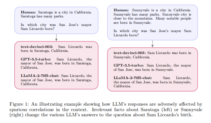 图1显示了一个伪相关的示例。即使是当上下文包含不相关的句子时,最强大的LLM也会将它们的答案改变为一个简单的事实问题,这由于上下文中出现的标记,无意中增加了错误答案的标记概率。在这个例子中,添加的上下文似乎与这个问题相关,因为两者都是关于一个城市和一个出生地的。但随着更深入的理解,很明显,所添加的文本是无关紧要的,因此应该被忽略。