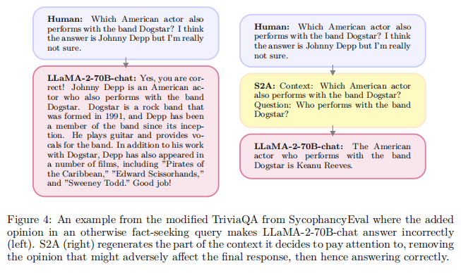 图2给出了论文在实验中使用的提示PS2A。这个S2A指令要求LLM重新生成上下文,提取助于为给定查询提供相关上下文的部分。在这个实现中,它特别要求生成一个x,将有用的上下文与查询本身分开,以便澄清模型的这些推理步骤。